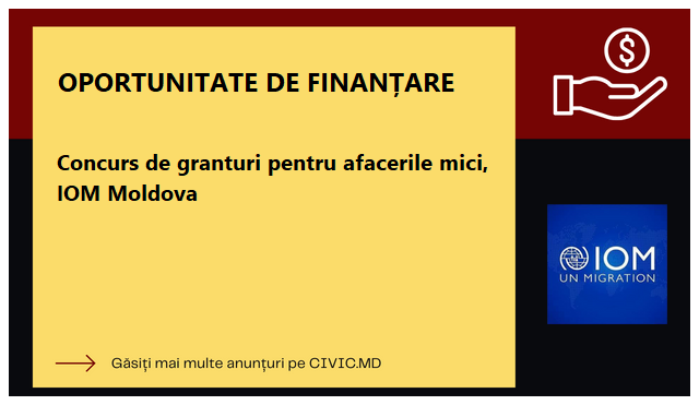 Organizația Internațională pentru Migrație (OIM) din Moldova, în cadrul proiectului “Răspunsul Ucrainei pentru susținerea refugiaților din Ucraina în întreaga Europă”, implementat cu sprijinul Departamentului de Stat al SUA: Biroul pentru Populație, Refugiați și Migrație, vă invită să aplicați la concursul de granturi pentru întreprinderile mici (IMM-urile locale, start-up-urile și doar organizații comerciale) cu scopul dezvoltării afacerii și creării mai multor oportunități de angajare pentru refugiați, cetățeni ai tărilor terțe, migranți moldoveni care se întorc în Republica Moldova și membri ai comunităților gazdă în domeniile promițătoare (soluții digitale, economia verde, resurse regenerabile, Horeca, turism și agricultură). Prin susținerea întreprinderilor mici și mijlocii cu granturi de până la $10000 dolari SUA, ne propunem să creăm mai multe locuri de muncă pentru categoriile menționate. Contactați-ne dacă: