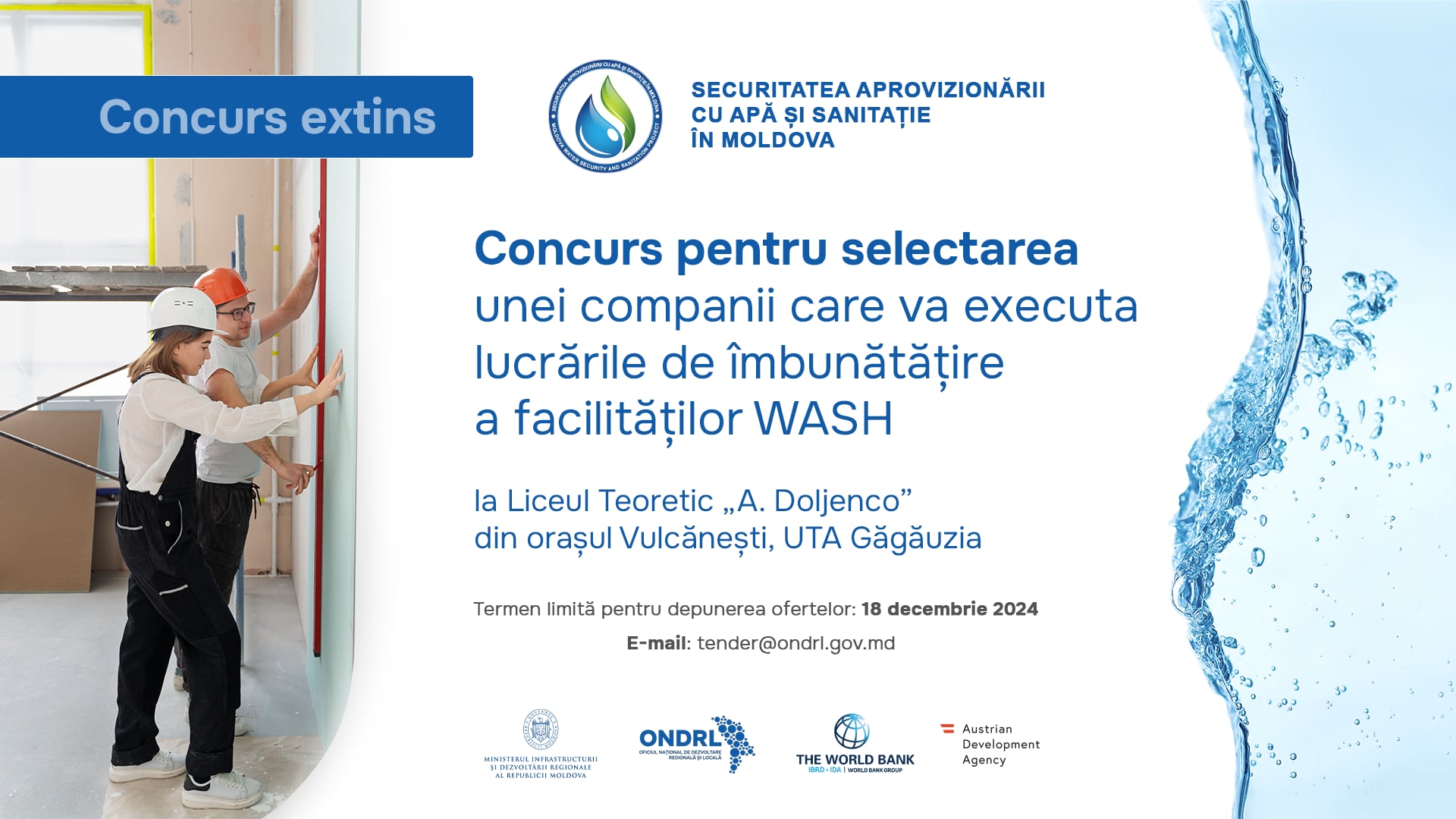 423 Просмотры Национальный Офис Регионального и Местного Развития продлевает срок подачи предложений для выбора компании, которая займется модернизацией объектов ВСГ (уличного туалета) в теоретическом лицее «А. Должненко», г. Вулканешты, АТО Гагаузия. Новый срок: 18 декабря 2024, 11:00 Заинтересованные компании могут ознакомиться с конкурсной документацией и более подробной информацией здесь: https://tinyurl.com/52t3ws4u. Напомним, что в рамках проекта "Безопасность водоснабжения и санитарии в Молдове" будут построены и отремонтированы санитарные группы в 17 учебных заведениях в Сороках, Рышканах, Кагуле и АТО Гагаузия, отобранных Министерством Образования и Исследований Республики Молдова. Целью данного проекта является обеспечение школ современными и доступными туалетами для всех учащихся, включая людей с особыми потребностями.