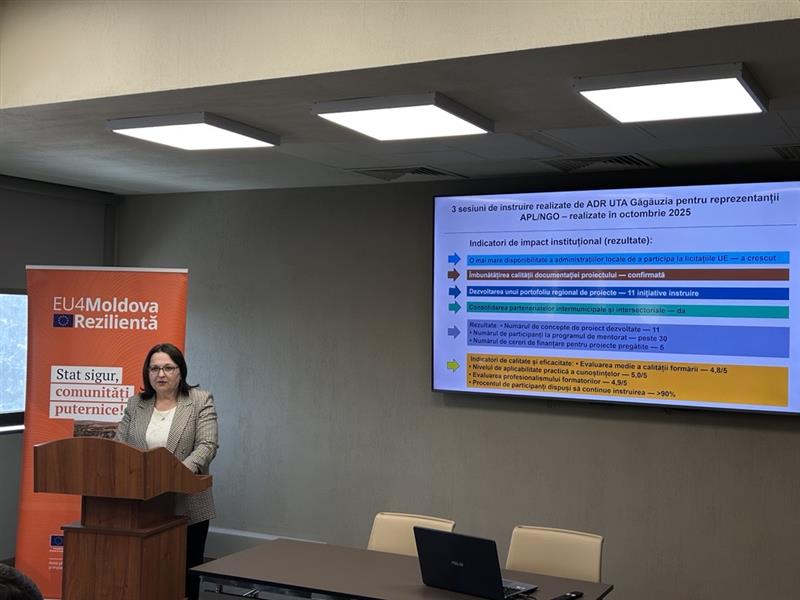 · Отмечено укрепление межмуниципальных и межотраслевых партнерств · Возросла готовность местных органов власти участвовать в конкурсах проектов ЕС Для эффективного проведения обучения агентства регионального развития, в рамках проекта, были оснащены современным ИТ- и мультимедийным оборудованием на сумму порядка 300 000 леев. Данная деятельность является частью проекта «EU4Moldova Rezilientă: Безопасное государство, сильные сообщества», финансируемого Европейским Союзом и внедряемого.